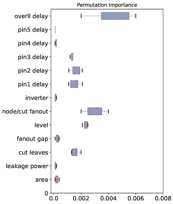 We finally perform feature importance evaluation by randomly permuting the features on the test dataset, as shown in Figure 5. In general, a higher value for each feature indicates its greater importance in the learning model. It can be observed that the overall delay (including the max and sum delay of supergates) extracted from the supergate is the most crucial factor in our designed learning model, followed by the node/cut fanout feature. On the other hand, features such as leakage power and fanout gap are relatively less significant. It has been observed that the delay importance of pins 4 and 5 is notably low, primarily because, in the ASAP 7 nm library [39], the majority of standard cells have fewer than three input pins.