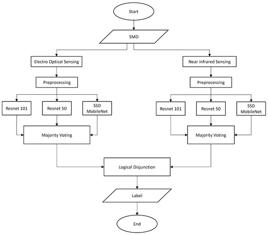 This research focuses on solving the challenge of maritime object detection under diverse weather conditions by using visible light (camera) sensors and near-infrared (NIR) imagery, representing distinct data collection modalities. A flowchart of the proposed model is illustrated in Figure 2. In the preprocessing stage, data from each modality is prepared for analysis using noise reduction and normalization. The processed data is then forwarded to these selected models—ResNet 101 and ResNet 50 for image recognition, and SSD MobileNet, optimized for mobile and embedded vision applications. Predictions from these models are combined through Majority Voting, an ensemble technique that enhances decision robustness and accuracy. The outputs from both pathways are integrated using a logical disjunction (logical OR), resulting in a final decision. Each module in this flowchart is interconnected, ensuring a systematic approach to sensor-based data analysis to solve the abovementioned challenge. These models are precisely trained separately on datasets comprising camera and NIR data, allowing them to become proficient in detecting maritime objects within their respective modalities.