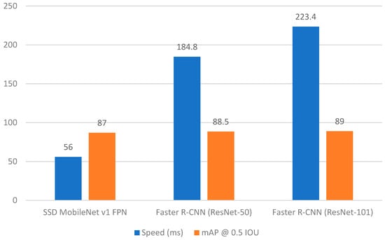For electro-optical images, SSD MobileNet v1 FPN model, with a speed of 56 ms, managed to maintain a robust mAP of 87, presenting a well-balanced choice for object detection tasks in this domain. In the electro-optical domain, the Faster R-CNN model with a ResNet-50 support exhibited a speed of 184.8 ms and excelled in mAP, achieving a score of 88.5, making it a suitable choice for scenarios prioritizing accuracy over speed. Similarly, the Faster R-CNN model with a ResNet-101 backbone, although slower at 223.4 ms, further elevated accuracy with a mAP of 89, rendering it a valuable model for applications demanding precision. These results are collectively displayed in Table 2 and Figure 9.