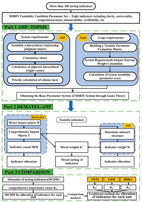 According to the above analysis, this paper adopts the MCDM method for application to the testability modeling and allocation of a MIRFS, so as to meet the testability of the whole life process of the MIRFS. Therefore, a testability allocation method based on MCDM is proposed, as shown in Figure 1. This method is mainly divided into two parts. The first part is to screen a large number of testability indicators to obtain the MIRFS basic parameter framework. The second part is to establish a MIRFS testability allocation model and allocate testability indicators to the parameters in the basic parameter framework obtained in the first part to verify the rationality of the allocation model.