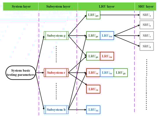 Based on the system testability parameters, new parameters are included according to specific requirements. At this point, , , and . Unlike traditional systems, synthesis enables the of the MIRFS to serve multiple subsystems under algorithmic allocation. The parameter set corresponding to m is denoted as , which needs to retain the parameters of subsystem m. The layer parameter is determined to be consistent with the subsystem layer. For example, in the three-level maintenance system, and are also referred to as and , meaning that and should retain subsystem parameters 1 and 3, while also retaining subsystem 2 parameters.