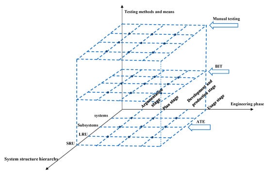 The testability indicator framework constructed from the first three perspectives is closely interrelated and permeates throughout the entire system design process. The MIRFS testability design process should comprehensively incorporate all three key aspects and establish a three-dimensional testability indicator framework that is applicable to various testability methods, the complete system lifecycle, and the overall system structural hierarchy, as clearly illustrated in Figure 4.