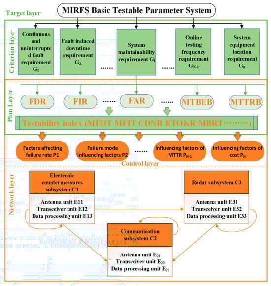 Select typical influencing factors as criterion layer elements (Pi) and divide the MIRFS into three subsystems, communication, radar, and electronic countermeasures, according to their functions, as network layer element groups (). consist of system reconfigurable antenna units (), integrated transceiver units (), and data comprehensive processing units (). The detailed MIRFS testability allocation model is clearly illustrated and shown in Figure 5 below.