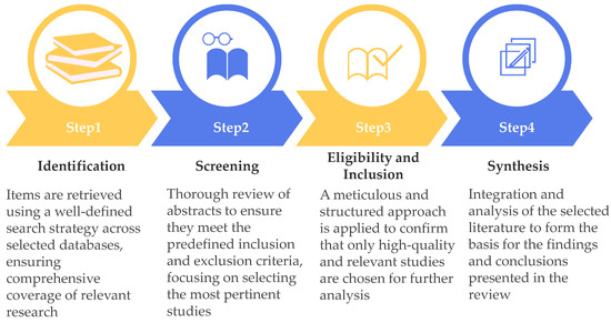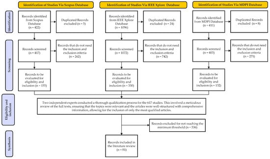 Scopus is known for its stringent content selection policies and wide-ranging coverage across various fields, providing access to high-quality, peer-reviewed content. Its advanced analytical tools and bibliometric indicators further enhance the reliability and depth of our review. IEEE Xplore, a premier resource for electrical engineering and related disciplines, offers access to influential and frequently cited publications, including the latest and most relevant research. MDPI, as a fully open access publisher, guarantees that our review includes peer-reviewed research accessible to a broad audience, fostering inclusivity and the widespread dissemination of knowledge.