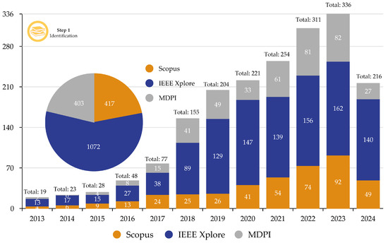 These items were distributed across the databases: 417 items from Scopus, 1072 items from IEEE Xplore, and 403 items from MDPI (Figure 2). These results were anticipated due to the nature and scope of each database. Scopus, known for its broad interdisciplinary coverage, provides extensive indexing of journals from various fields, including engineering and technology. The 417 items retrieved from Scopus reflect its comprehensive approach and wide-ranging repository. As a specialized database focusing on electrical engineering, computer science, and electronics, IEEE Xplore naturally yielded the highest number of items, 1072. This is consistent with its reputation as the leading source for high-quality, peer-reviewed technical literature in these disciplines. MDPI, as an open access publisher, offers a significant collection of peer-reviewed journals, particularly in science and technology. The 403 items from MDPI demonstrate its contribution to open access scientific literature and its relevance to our research focus. The detailed distribution across these databases underscores the robustness of our search strategy and the comprehensiveness of the datasets acquired for the Screening phase.