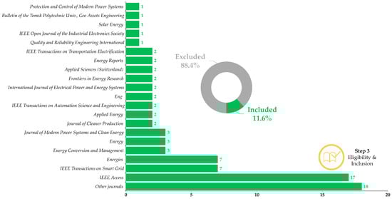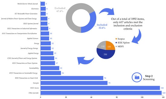As shown in Figure 3, the infographic illustrates the Screening-stage process, which resulted in the exclusion of 1275 items and the inclusion of 617 items. Of the included items, 155 were from Scopus, 330 from IEEE Xplore, and 132 from MDPI. Regarding the distribution of included studies across journals, notable findings included IEEE Access with 141 articles, Energies with 79, IEEE Transactions on Smart Grid with 74, IEEE Transactions on Sustainable Energy with 24, Sustainability with 22, IEEE Transactions on Power Systems with 17, CSEE Journal of Power and Energy Systems with 16, Applied Energy with 15, Journal of Energy Storage with 12, Energy with 12, Applied Sciences with 10, and IEEE Transactions on Transportation Electrification with 10. Other journals collectively accounted for 185 articles. The infographic in Figure 3 visually summarizes the distribution of items by journal that passed the Screening phase.