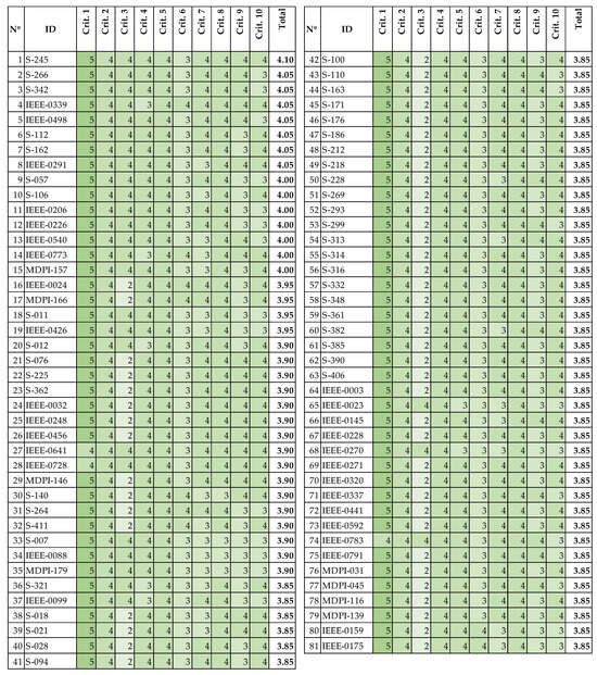 Figure 4 illustrates the results of this evaluation, providing a visual representation of the weighted criteria and their impact on the eligibility of each study. Based on the proposed weighting and the nature of the research, a minimum threshold of 3.85 out of 5 (77%) is suggested for an item to be considered eligible for inclusion in the literature review synthesis. This threshold ensures that only highly relevant and exceptional-quality studies are included in the review, addressing the need for comprehensiveness and methodological rigor. As of this stage in the literature review, 81 articles have been identified as eligible for inclusion.