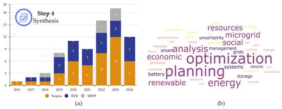 Finally, in the Synthesis phase, the reviewers integrate and analyze the selected studies to form the foundation for the findings and conclusions presented in this review. At this point, they utilize bibliometric analyses, such as word cloud maps, to identify frequently occurring keywords among the chosen studies, helping to define broad thematic groups to be addressed in the literature review. This step ensures that the review provides a structured and coherent presentation of the topics, offering readers a well-organized exposition of the key themes. These findings are thoroughly discussed in the Results and Discussions section (Section 3), where the synthesized information is presented to highlight the advancements, challenges, and future directions in microgrid planning and optimization for renewable integration.