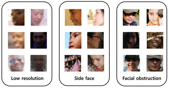 Additionally, this study addressed issues that could potentially arise during the synthetic data creation process. Among the images to be used as ID images, there were images whose resolution was so low that the face could not be properly identified, or where the eyes, nose, and mouth could not be fully synthesized because the subject’s face was not facing forward. It was also determined that images where the face is obscured by a shadow or the face is excessively covered by a hat, etc., could also be a problem in the synthetic data creation process. An example of an image determined to be problematic is shown in Figure 2. Therefore, data filtering was performed before data generation, and the difference between synthetic data before and after filtering is shown in Figure 3.