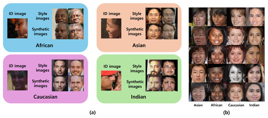 The ID image is composed of 7 races, whereas the style image is composed of 4 races, so to match the number of races, the 7 races were reclassified into 4 races by referring to FairFace [29]. Southeast Asian and East Asian were classified as Asian, and White, Middle Eastern, and Latino Hispanic were classified as Caucasian. Indian was classified as Indian and Black was classified as African. Latino Hispanic is often recognized as white, so it was classified as Caucasian. In addition, since the ID image should consist of 10,000 subjects, the final number of the 7 race subjects was also equalized. The final 7 race-specific numbers are shown in Table 2.