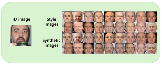 Ultimately, the total number of images in the synthetic dataset used to train the face recognition model was 500 K, and the images were composed of various ages, genders, and races, considering demographic perspectives. An example of the generated image is shown in Figure 4. These synthetic data consist of the Caucasian race and contain 18 style images and 18 corresponding synthetic images, and it was confirmed that the face of the ID image was naturally synthesized with the style image.