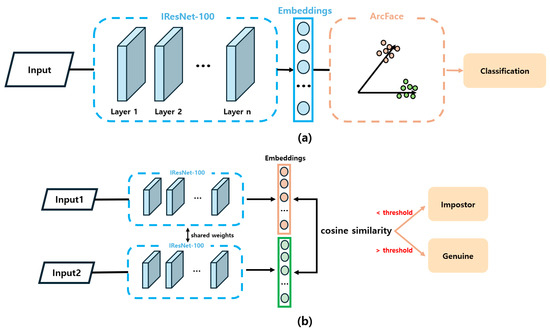 Face recognition model learning process: (a) figure of model train process; (b) figure of model inference process. IResNet-100 was used as a feature extractor, and a simple classification head was attached and used. ArcFace was used together during the training process.