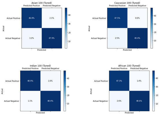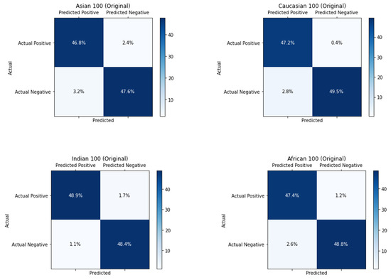 Going beyond the comparison of the accuracy and standard deviation before and after simple tuning, this paper presents confusion matrices for each race before and after tuning to verify whether fairness between races was achieved by tuning the generated dataset. Figure 6 and Figure 7 provide confusion matrices for the four races provided by BUPT-BalancedFace which were used as test datasets, namely Caucasian, African, Asian, and Indian, before and after each tuning. The confusion matrix was constructed by setting it to positive if the face image pair to be compared is the same subject, and negative if it is different. As a result, it can be confirmed that the performance of the Asian race, which did not show good classification performance compared with the other races before fine tuning, was improved when fine-tuning was performed with the dataset generated by the method proposed in this study.