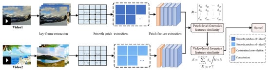 We use the method of fusing patch feature vector similarity to determine the similarity of two video source attributes. To determine whether videos and are from the same device, the two videos can be formally expressed as follows: , which means that video consists of m frames. , which means there are u smooth patches in frame . represents the feature vector of the smooth patch extracted by the algorithm in Section 5.2. , which means that video V consists of n frames. , which means that video consists of n frames. The specific algorithm is as follows:
