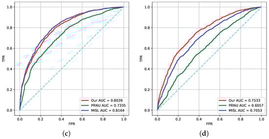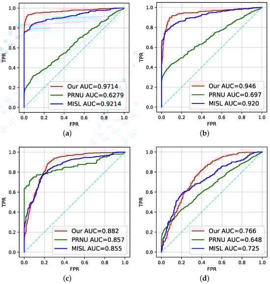 Figure 4a shows the receiver operating characteristic (ROC) [54] curves of our algorithm and the PRNU [53] and MISL [39] algorithms on the Daxing dataset, which is a closed set. It can be seen from the figure that our algorithm is obviously superior to other methods. Among them, the result of the PRNU algorithm on Daxing dataset is very poor because the videos of Daxing dataset are short videos and the number of key frames that can be used to calculate the PRNU value is very small. In Figure 4b, the ROC curves of our algorithm and the PRNU and MISL algorithms on the mixed datasets of Daxing and Vision are shown. It can be seen from the figure that our algorithm is obviously superior to other methods. Compared with the MISL algorithm, our algorithm has better results because our system uses smooth patches to train the optimized network, which can minimize the impact of scene content on forensic feature extraction and more fully extract noise forensic features for camera source recognition. In Figure 4c, the ROC curves of our algorithm and the PRNU and MISL algorithms on the vision dataset, which is an open set, are shown. It can be seen from the figure that our algorithm is obviously superior to other methods. This result shows that our algorithm also has good forensics effect on untrained datasets. In addition, in Figure 4d, to further prove the effectiveness of the algorithm, we use SOCRatES [55] video dataset for experiments. The experimental results show that the algorithm proposed in this paper is also effective on this dataset. Therefore, our algorithm has good generalization.