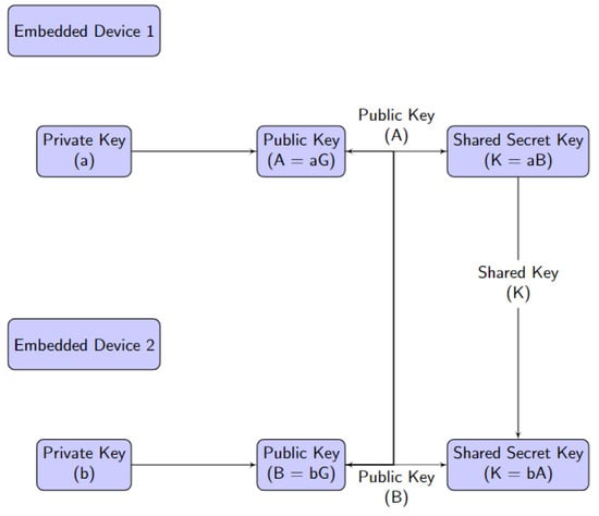 Moreover, hardware-based key generation has emerged as a viable solution for resource-constrained devices. Hardware security modules and trusted platform modules (TPMs) are specialized hardware components capable of generating cryptographic keys securely. These dedicated hardware modules offload key generation tasks from the main processor, minimizing the computational burden and enhancing overall system security. Hardware security modules and TPMs are particularly valuable in scenarios where sensitive keys must be protected from potential software-based attacks [14]. The adoption of lightweight elliptic curve cryptography also contributes to efficient key generation on resource-constrained devices. It involves selecting specific elliptic curves and parameters that offer a balance between security and performance. Key generation on these curves requires fewer computations compared to traditional ECC curves, resulting in reduced processing time and memory usage [34]. Figure 2 shows a block diagram of an elliptic curve Diffie–Hellman key exchange between resource-constrained devices.