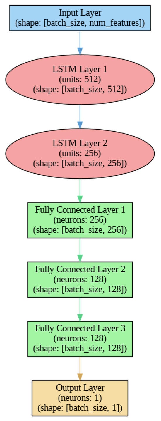The LSTM model is structured with two LSTM layers. The first LSTM layer has an input size corresponding to the number of features and contains 512 hidden units, while the second LSTM layer reduces the dimensionality to 256 hidden units. On the top of the LSTM layers, the model includes a series of fully connected layers: the first layer has 256 neurons, the second layer has 128 neurons, and the third layer also has 128 neurons. The output layer consists of a single neuron, which produces the final prediction of energy consumption. The activation function applied to the hidden layers is the Rectified Linear Unit (ReLU), and dropout regularization is implemented with rates of 20% and 10% after the first and second fully connected layers, respectively, to mitigate overfitting.