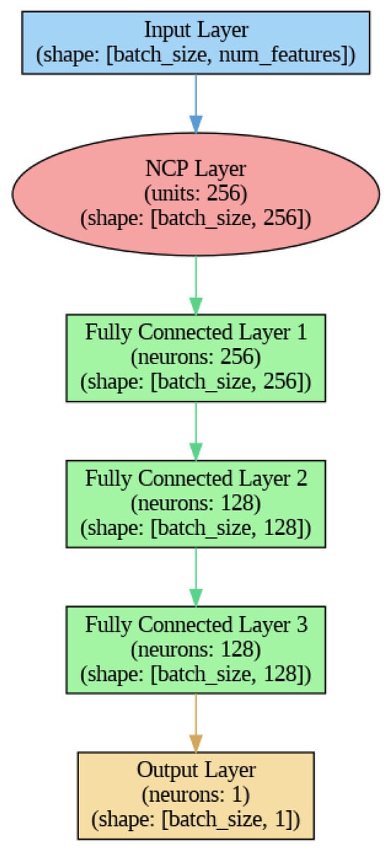 The NCP model employs a Nonconventional Connection layer from the CfC (Closed-form-Continuous-time) library, which consists of 256 hidden units. Similar to the LSTM model, it features four fully connected layers, the first with 256 neurons, the second with 128 neurons, and the third with 128 neurons, culminating in a single-neuron output layer. ReLU activation is utilized in the hidden layers, accompanied by dropout regularization at rates of 20% and 10% after the first and second fully connected layers, respectively.
