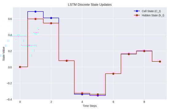 Discrete state updates in an LSTM network. The figure illustrates how the cell state and hidden state are updated at each discrete time step.