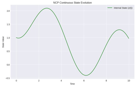 Continuous state evolution in an NCP model. The figure shows the continuous trajectory of the internal state over time, governed by ODEs.