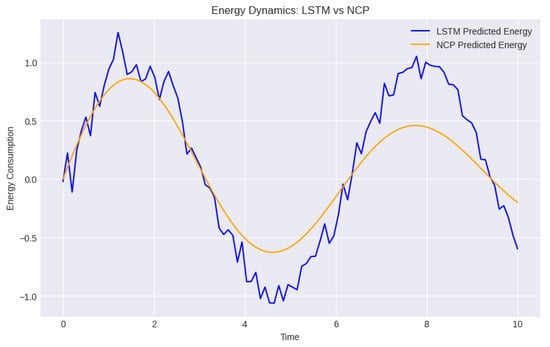 Comparison of energy dynamics between LSTM and NCP. This graph compares the predictive performance of both models in capturing energy consumption dynamics, illustrating the advantages of continuous modeling in NCPs.
