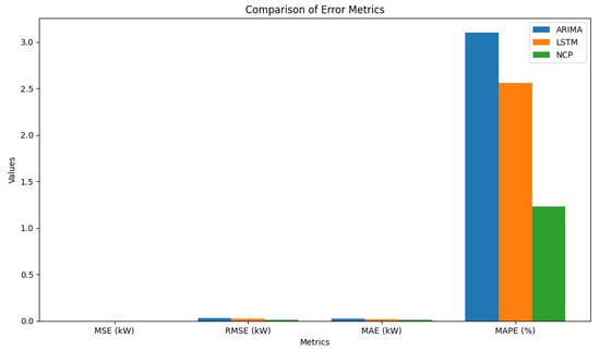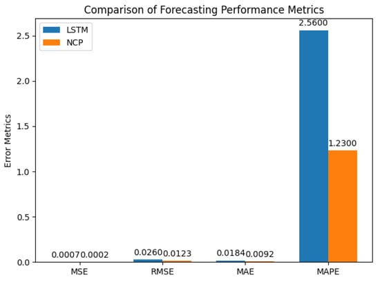 The superior performance of the NCP model is further illustrated in Figure 6, which compares the MSE, RMSE, MAE, and MAPE metrics between the LSTM and NCP models.