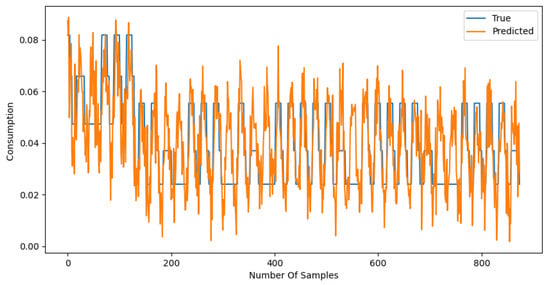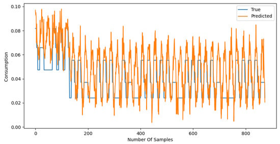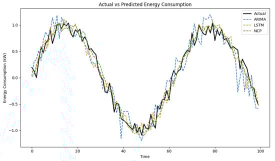 The graphical representations of the predictions for both models further illustrate these findings (see Figure 7 and Figure 8). The NCP model’s predictions closely follow the actual consumption values, indicating its superior ability to generalize from the training data to unseen instances. Conversely, the LSTM model exhibits greater divergence from the actual values, particularly during periods of rapid change in consumption.