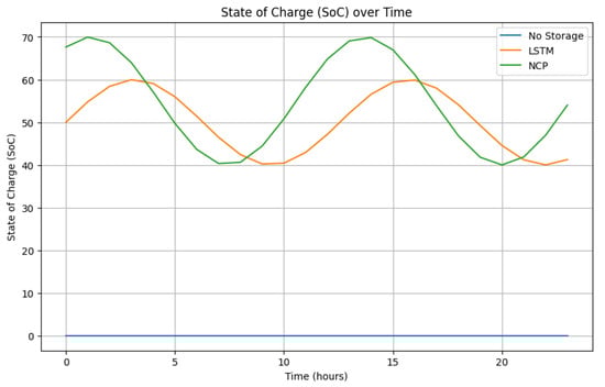 - Battery Charging–Discharging: The NCP model can directly incorporate the physical dynamics of battery storage:where is the efficiency of the energy storage system. This equation directly models how energy levels evolve over time, a process that is more challenging to capture with LSTM networks due to their reliance on discrete time steps.
