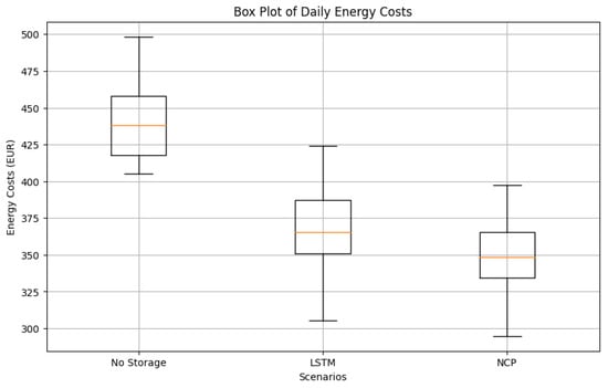 Box plot of daily energy costs for different scenarios: no storage, LSTM, and NCP.