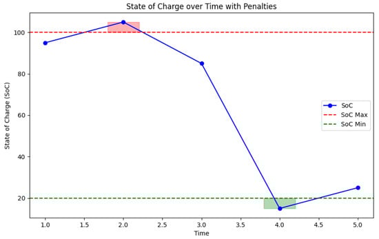 State of charge (SoC) over time with penalties indicated for violations of capacity limits. The shaded areas represent the penalties incurred when the SoC exceeds the maximum or falls below the minimum limits.