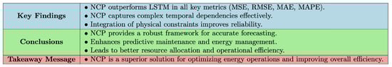 Lastly, our work contributes to the growing body of literature on predictive maintenance by illustrating how NCPs can provide more reliable forecasts that inform maintenance strategies. By embedding physical constraints into the learning process, NCPs offer a more holistic understanding of system dynamics, which is crucial for effective decision-making in energy management. This study not only highlights the potential of NCPs as a transformative approach in energy forecasting but also sets the stage for future research into hybrid models that can further improve predictive capabilities in complex energy systems.