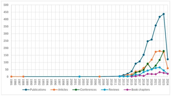 The first paper in this field was published in 1985, followed by a period of sparse production until 2012, when exponential growth began. This growth reached its peak in 2023, with 438 publications (Figure 1) noted. While the number of conference papers continues to show a positive trend, the number of articles, reviews, and book chapters has declined. Overall, the annual growth rate in the number of publications stands at 9.5%.