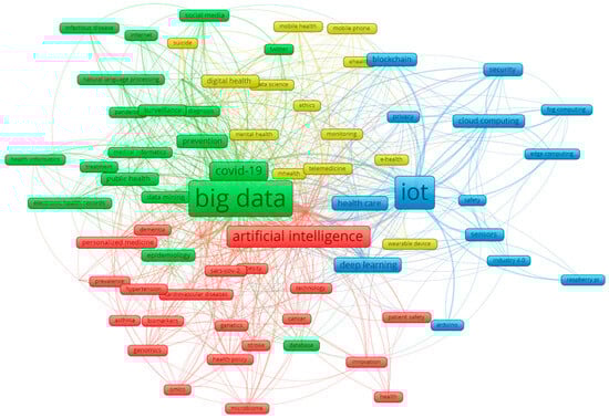 Some interesting hot spots were identified by comparing different time slices in the research landscape. The Internet of medical things (IoMT) is used in occupational safety monitoring, for the rapid diagnosis of viral respiratory infections, and in precision medicine [94]. In combination with federated learning, it is used for handling privacy-sensitive medical data, for analyzing wireless long-tailed data [95], and in smart healthcare [96]. IoT and big data collected from smartphones, in combination with machine learning and AI, are used to improve the management, diagnosis, and treatment of high-prevalence diseases like hypertension [95], dementia and cognitive impairment [97], or sleep disorders [98], as well as in trends analysis [99], injury prevention [100] and in solving privacy [101] and safety issues [102].