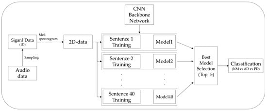 Figure 2 illustrates the process diagram of this study. To process the input audio data, it is initially converted into one-dimensional data through sampling. Subsequently, the Mel–spectrogram technique is applied to transform the data into a two-dimensional format. The transformed data undergoes modeling for each of the 40 voice sentences using various CNN backbone networks, such as AlexNet, VGGNet, ResNet, DenseNet, and EfficientNet. Among the trained models, the top 5 models with superior performance are selected. Utilizing these chosen top five models, this study classifies cognitive impairment into three categories: NM, AD, and PD. Finally, the results of the five selected models are ensembled and combined to present the ultimate ternary classification outcome.