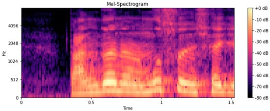 The Mel–spectrogram is used to visually represent recorded time-series voice data by converting it into the frequency and time domains [29]. This technique is primarily utilized in fields such as speech recognition and music analysis, allowing for the detailed analysis of the characteristics and changes in the time-series signals. The data transformed through the Mel–spectrogram are represented along the frequency axis, time axis, and intensity of the audio signal. The frequency axis denotes the frequency range of the recorded voice, covering the range from 0 to 20,000 Hz. The time axis includes the temporal changes of the audio signal. Audio intensity is represented by color, with darker colors indicating a higher intensity and lighter colors indicating a lower intensity.
