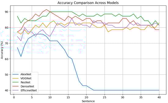 The figure shows the results of the accuracy comparison across models. The graph illustrates the performance trends of various CNN architectures (AlexNet, VGGNet, ResNet, DenseNet, and EfficientNet) as the number of sentences used in the model increases from 1 to 40.