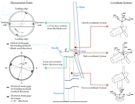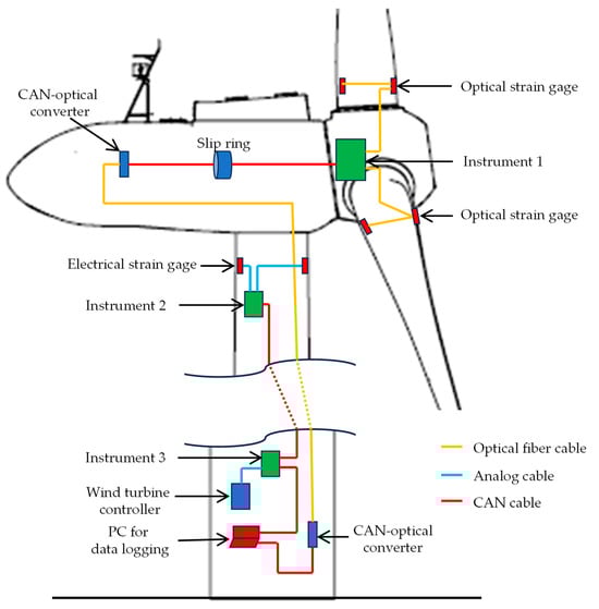 The measurement system is shown in Figure 2, and the instruments and sensors are shown in Table 2. While general electrical strain gages were used to measure the tower, fiber optic strain gages were used to measure the blades, which are highly resistant to environmental conditions such as lightning strikes. Basically, wired CAN communication was used for data transmission, but existing optical fiber communication was used for transmission from the nacelle to the tower bottom. Strain at the blade root, strain at the tower top, and wind turbine operating conditions output from the wind turbine controller were integrated into a PC installed at the tower bottom, where they were synchronously measured, and data were stored.