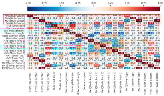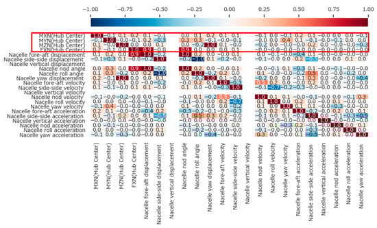 To determine parameters with which to predict hub center loads, the correlations among hub center loads, main loads, and wind turbine behavior were investigated. The Pearson correlation coefficient was used as an index of correlation, with a value closer to 1 indicating a positive correlation, a value closer to −1, a negative correlation, and a value of 0 no correlation. For the evaluation, 10 min data from an aeroelastic analysis at an average wind speed of 14 m/s were used. The DataFrame.corr function of the Pandas library in the Python programming language was used for the analysis.