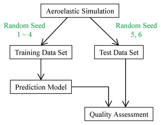 The flow of developing a machine learning model is shown in Figure 5. Here, the aeroelastic analysis results were divided into a training dataset and a test dataset, but rather than dividing all the data randomly, the cases with turbulent seeds 1 to 4 were used as the training dataset (128 cases), and the cases with turbulent seeds 5 and 6 were used as the test dataset (64 cases). This is because when the data for the same analysis case are divided into training and test datasets, the data for adjacent times are very similar and not completely independent, and there is a risk of overestimating prediction accuracy due to data leakage.