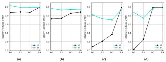 Model accuracy: DEL (m = 10) ratios of (a) MXN, (b) FXN, (c) MYN, and (d) MZN.