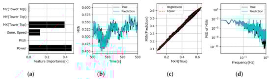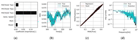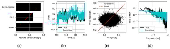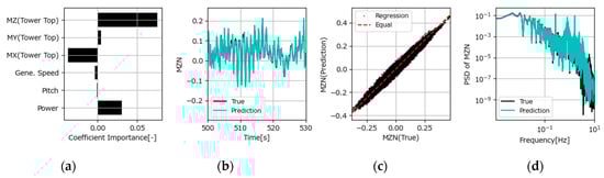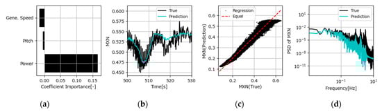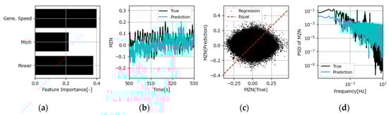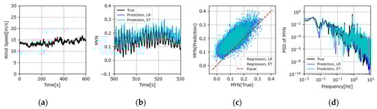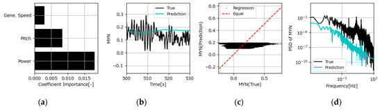 For the prediction of MXN (Figure 8, Figure 9, Figure 10 and Figure 11), the linear model LR using operating conditions Pr1 (Figure 8) can predict slow fluctuations due to the contribution of the output but not fast fluctuations. When the nonlinear model ET is used (Figure 9), fast fluctuations are also predicted, but the oscillation phases are not aligned. By adding the tower top loads to the explanatory variables (Figure 10 and Figure 11), we can also predict fast fluctuations due to the contribution of tower top MX.