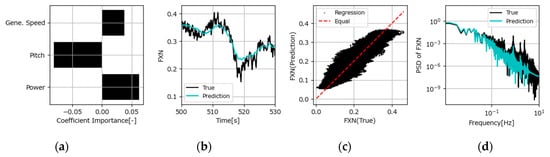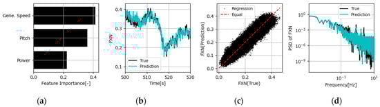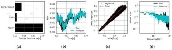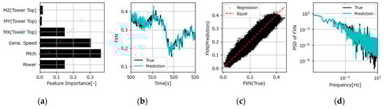 where is the load of i-th range bin of the fatigue load spectrum, is the number of cycles in the i-th range bin of the fatigue load spectrum, and is the reference number of load cycles. MXN LR results show that the DEL ratio can be small even when R2 is close to 1, so caution is required. The results of Pr1, Pr2, and Pr3 for MXN and FXN show that changing the machine learning model from LR to ET improves the analysis accuracy of DEL. On the other hand, MYN Pr4 has high analytical accuracy with LR but slightly lower with ET, so ET is not necessarily superior. FXN is below 0.95 for all models and indices, so if higher prediction accuracy is required, it is necessary to consider changing the explanatory variables, etc. While MYN requires the inclusion of loads at the tower top to improve the analysis accuracy, MZN has high prediction accuracy even with loads at the tower bottom, so the variables to be obtained depend on the target load.