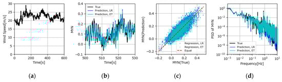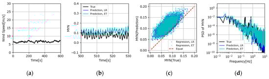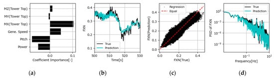For FXN prediction (Figure 12, Figure 13, Figure 14 and Figure 15), even the linear model LR using operating conditions Pr1 (Figure 12) can predict slow fluctuations due to the contributions of pitch angle, power, and generator speed but cannot predict fast fluctuations. When the nonlinear model ET is used (Figure 13), the prediction accuracy of fast fluctuations improves, but the phases are not aligned. Adding the tower top loads to the explanatory variables (Figure 14 and Figure 15) slightly improves the prediction accuracy due to the contribution of tower top MX, but not significantly.