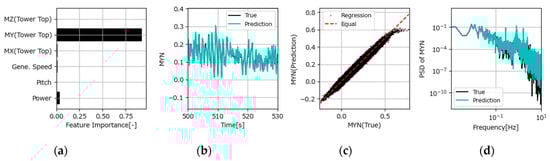 For MYN prediction (Figure 16, Figure 17, Figure 18 and Figure 19), the linear model LR using operating conditions Pr1 (Figure 16) outputs almost constant values and cannot be predicted. When the nonlinear model ET is used (Figure 17), the fast fluctuation component is included, but the oscillation phase is not correct. Adding the tower top loads to the explanatory variables (Figure 18 and Figure 19) improves the prediction accuracy due to the contribution of tower top MY, and both slow and fast fluctuations are generally predicted. However, in the case of the nonlinear model ET (Figure 19), the prediction is not accurate when the true value is large, and this may be because the training dataset does not contain such large values.