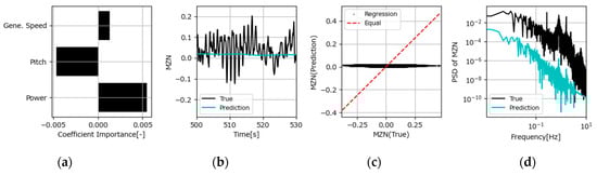LR model prediction of MZN using input feature set Pr1: (a) Coefficient importance. (b) Time history. (c) Correlation. (d) Frequency distribution.