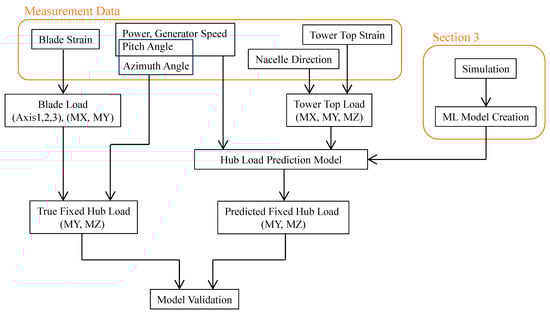 As presented in this section, the predictive models of hub center loads developed in Section 4 were validated by using measured data from the actual wind turbine. The validation method is shown in Section 5.1, and the results in Section 5.2.