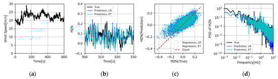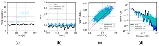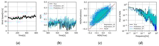 The verification flow is shown in Figure 24. By using the strain measured at the blade root, the blade loads were calculated, and by combining them with the pitch angle and azimuth angle data, the measured hub center loads were calculated and used as the true values. On the other hand, the tower top loads were calculated by using the strain measured at the tower top and the nacelle direction angle, and the three operating conditions were added to them as explanatory variables; finally, the hub center loads were calculated by using the linear (LR) or nonlinear (ET) machine learning model developed as shown in Section 4 and used as the predicted values.