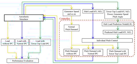 The performance evaluation flow of IPC is shown in Figure 31. Three controllers were prepared for the simulation. The first one was a controller without IPC, the second one a controller that implements general IPC based on MYN and MZN, and the third one a controller that predicts the hub center loads by using a machine learning model with tower top loads and operating conditions as inputs (see Section 4) and implements IPC based on the predicted loads. Here, due to software constraints, only MY and MZ were input as tower top loads, and MX was not used. However, since the contribution of tower top load MX to the prediction of MYN and MZN is small (see Figure 18 and Figure 22), the impact is minor. For the machine learning model, we used the easy-to-implement Linear Regression (LR) model because there was no significant difference in prediction accuracy between linear and nonlinear models when the tower top loads were used (see Section 4 and Section 5). The performance of IPC with the tower top loads was evaluated by performing an aeroelastic analysis on the three controllers and comparing the results. IPC was carried out according to Equation (2).