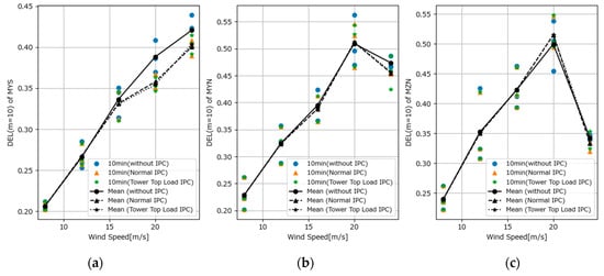 For the aeroelastic analysis, three input winds with different turbulent seeds were prepared for average wind speeds of 8, 12, 16, 20, and 24 m/s, and the analysis was performed for 10 min for each. The results of the evaluation for blade root MY, MYN, and MZN with the DEL (m = 10) are shown in Figure 32. No significant effect of IPC was seen in MYN or MZN, but a significant effect was seen in blade root MY at high wind speeds above 16 m/s. This is an effect for a wind turbine with a rated power of 2 MW and a rotor diameter of 86 m, which is relatively small for today’s wind turbines, and a larger effect can be expected for larger wind turbines due to the large variation in wind speed on the rotor plane. IPC with the tower top loads was shown to be as effective as general IPC with hub center loads, indicating the potential of IPC with tower top loads.
