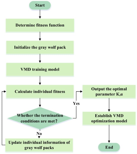 The choice of the decomposition layer  and penalty factor  in VMD significantly influences the decomposition performance, making it challenging to manually select the most effective parameters. Therefore, this study adopts the GWO algorithm and utilizes the fitness function of the Minimum Envelope Entropy to optimize the hyperparameters of VMD. The fitness function is given in Equation (1). The flowchart of the GWO-VMD is shown in Figure 2.